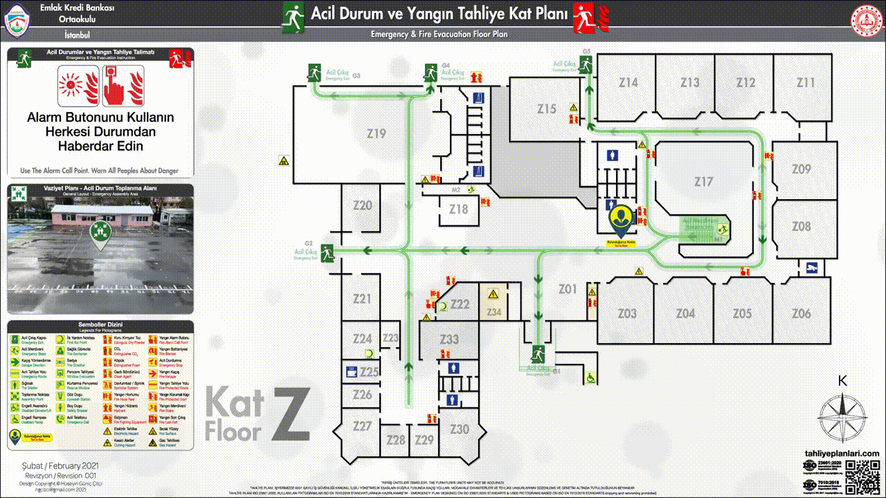 - Tahliye Krokisi olan isimlendirilen çalışma, çıkışı gösteren kroki olmayıp, “İşyerlerinde Acil Durum Yönetmeliği” Madde 10 gereği “Binaların yangından Korunması Hakkında Yönetmelik” Madde 30-31-32-33 gereği düzenlenmiş ve işaretlenmiş acil kaçış yollarını gösterir.