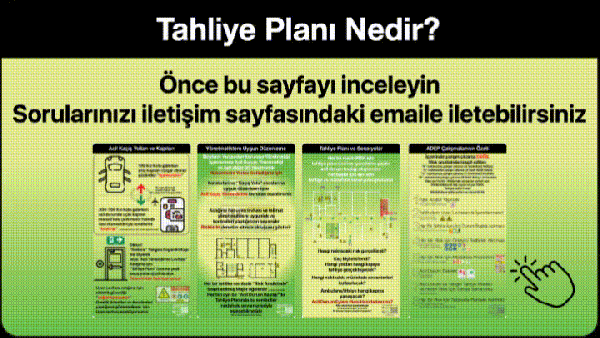 - Asılan Tahliye Kat Planları genellemedir. ADP dosyası kat/bölüm/eklenti bazında ve ADP başlıklarına göre tahliye planı devşirme ve ADP dosyasına entegre edilmesi ayrı bir çalışmadır.