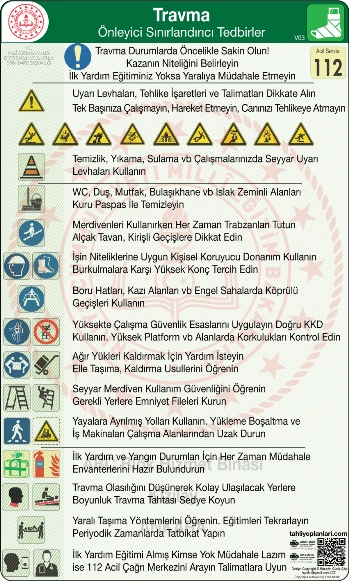 İşyerinizde düşme, kayma, malzeme taşıma söz konusu olduğu müddetçe travma riski mevcuttur. Ana girişe yakın noktada acil durum panosunu asmakla beraber, işyerinde mevcutsa, mutfak, malzeme depoları, ambar, yüksekte çalışma yapılan vb alanlarda panoyu asmanız yerinde olacaktır.
