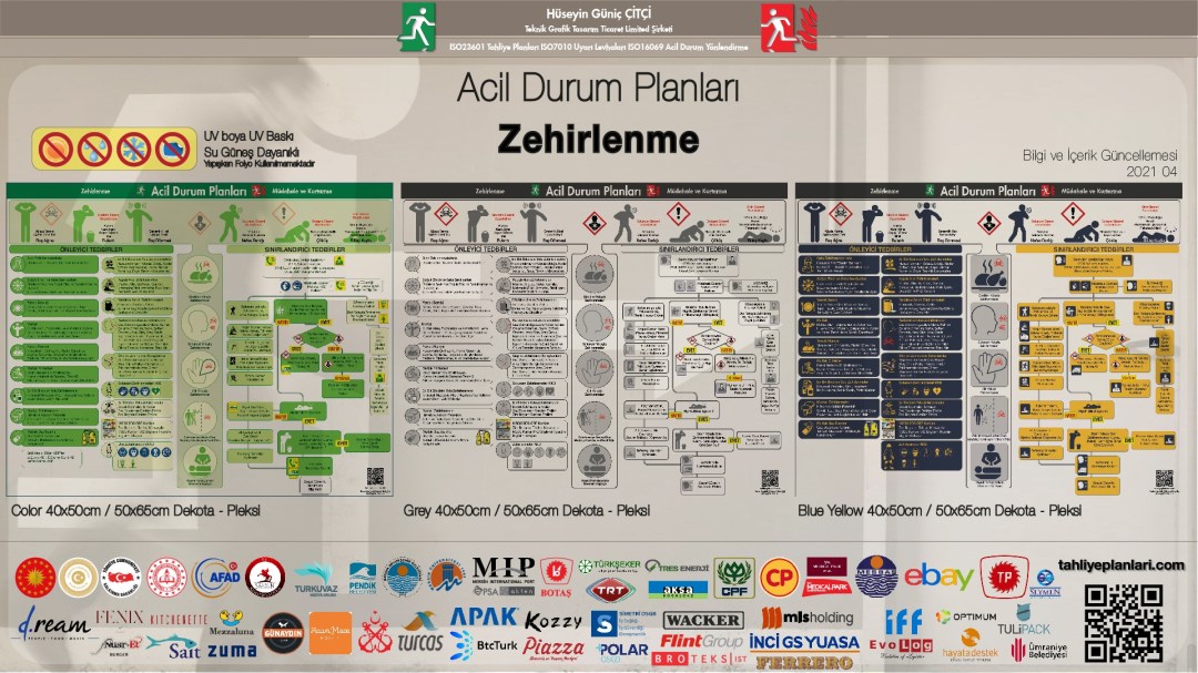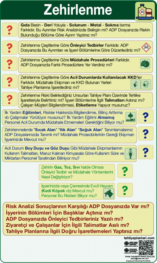 Acil Durum Müdahale Planları İşyerinin Risk Analizi Doğrultusunda İş Güvenliği Uzmanı tarafından Hazırlanmalıdır . Zehirlenme acil durum müdahale planının A4 kağıt çıktısı ADP Dosyası dahilinde kullanım içindir. Dekota malzemeye baskı panosu; çalışan, ziyaretçi ve müşterilerin bilgilendirilmesi için, ana giriş yakınına, işyeri bölümlerinde tehlikeli madde, gıda zehirlenmesi, toksik madde kullanılan yerlerde tekrarlanarak asılmalıdır.