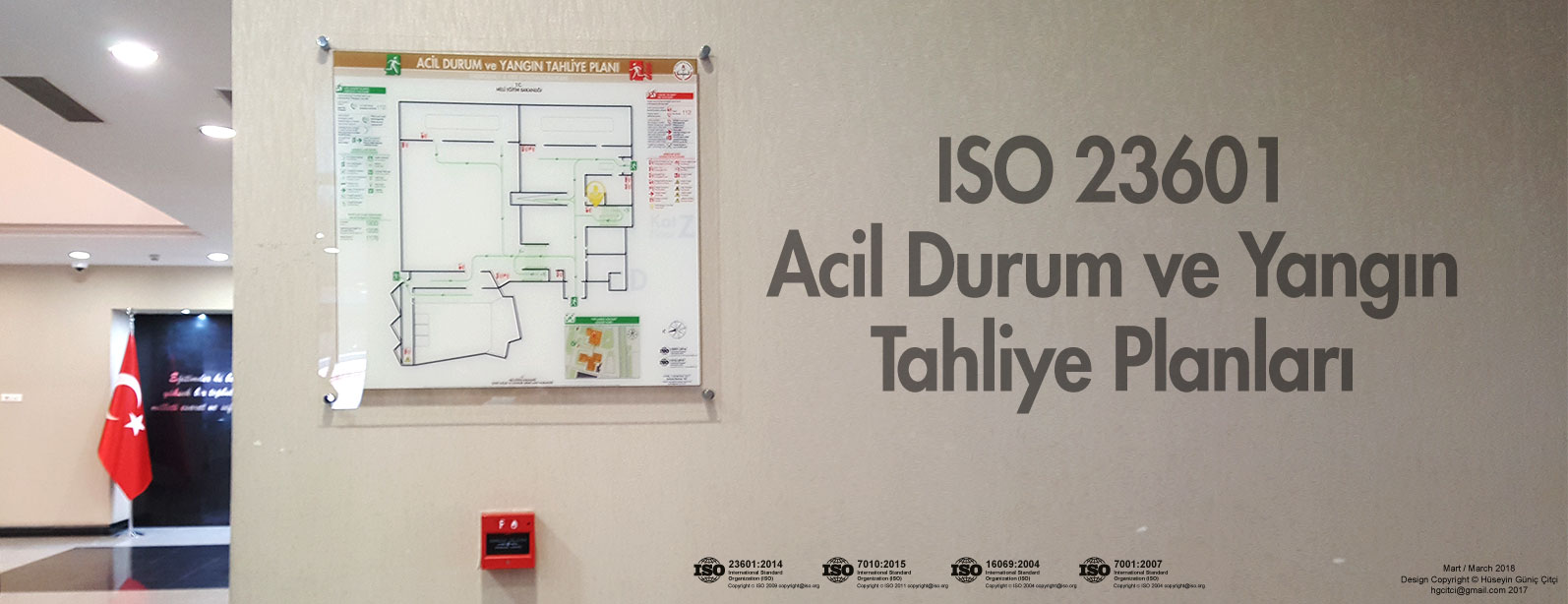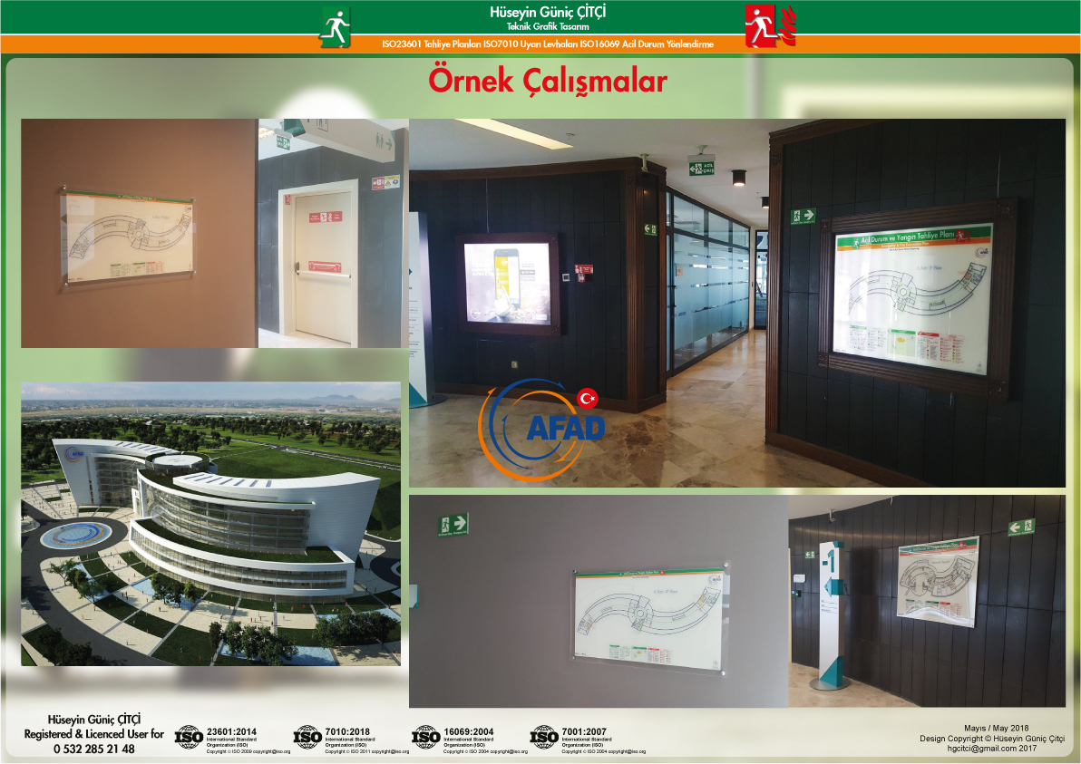 AFAD Acil Durum ve Afet Yönetimi Başkanlığı ISO 23601 Tahliye Planları, ISO 16069 Acil Durum Kaçış Yönlendirmeleri ve ISO 7010 Uyarı Levhaları konusunda en başarılı uygulama örneğine sahip kurumların başında gelir. AFAD Başkanlık binası diğer tüm işyerlerine örnek teşkil edecek donanımdadır.
