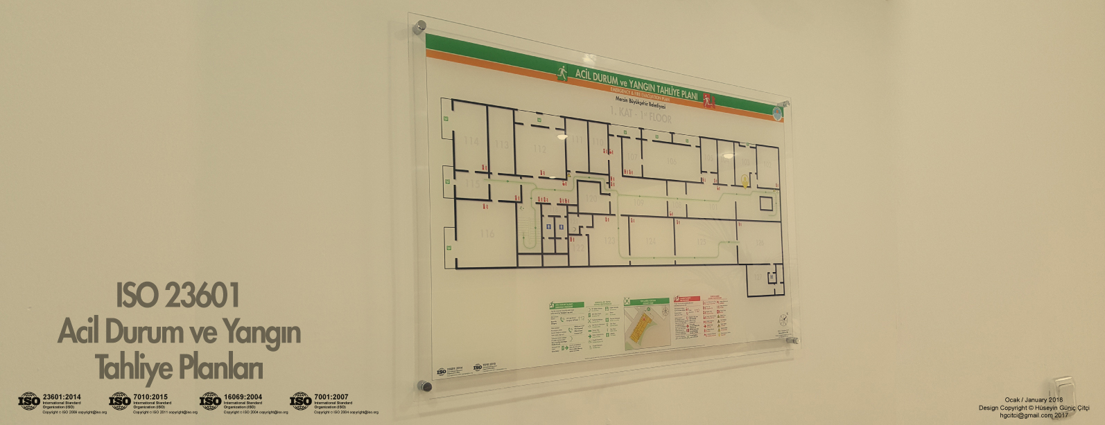 Mersin Büyükşehir Belediyesi Sağlık Daire Başkanlığı , iş sağlığı ve güvenliği müdürlüğü tüm büyükşehir belediye hizmet birimlerinde ISO 23601 Acil Durum ve Yangın Tahliye Kat Planlarını kullanmıştır.